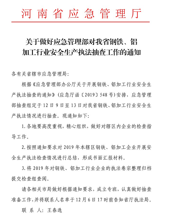 應(yīng)急管理部12月9日-13日對(duì)河南鋼鐵鋁加工行業(yè)安