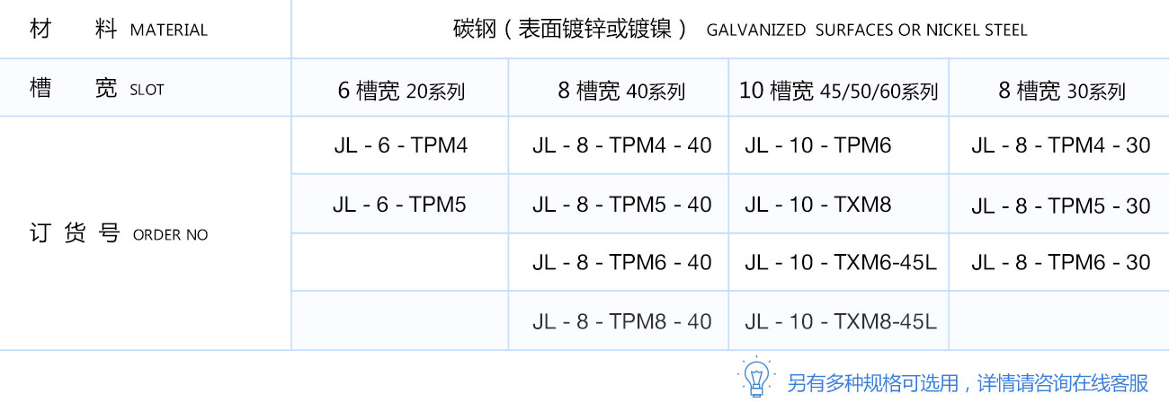彈片螺母塊能被直接塞進(jìn)鋁型材槽坑中的任意裝配點(diǎn),他背部的彈片能撐起并固定它的位置,使安裝十分簡單且可靠,它是型材連接中使用較多的配件之一。